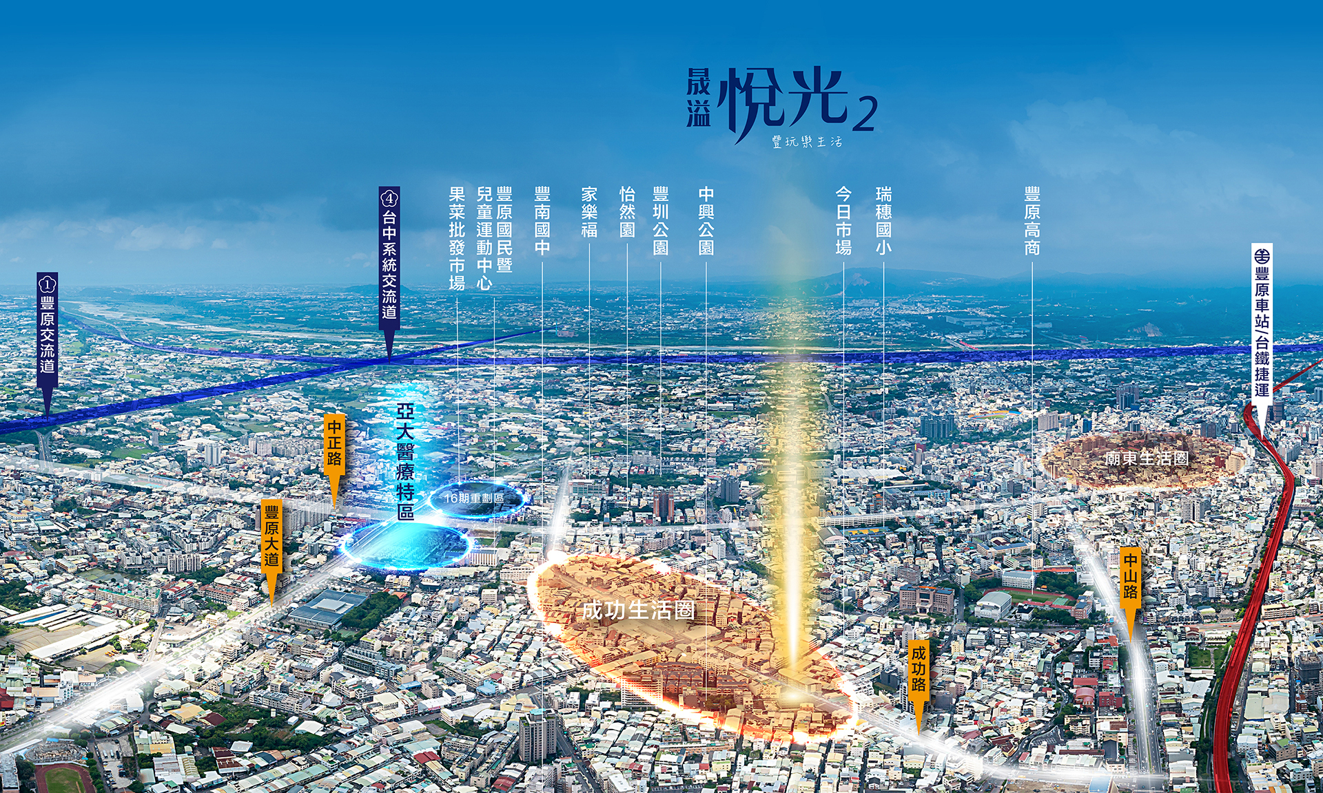 豐原市區心臟地帶,緊鄰成功商圈、亞大醫療特區,雙重優勢兼具,稀有黃金地段,成就自住與投資雙贏。 |