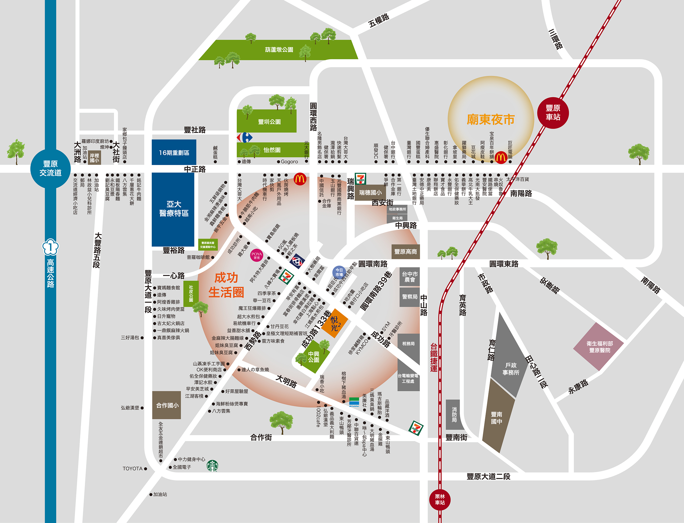 豐原市區心臟地帶,緊鄰成功商圈、亞大醫療特區,雙重優勢兼具,稀有黃金地段,成就自住與投資雙贏。 |